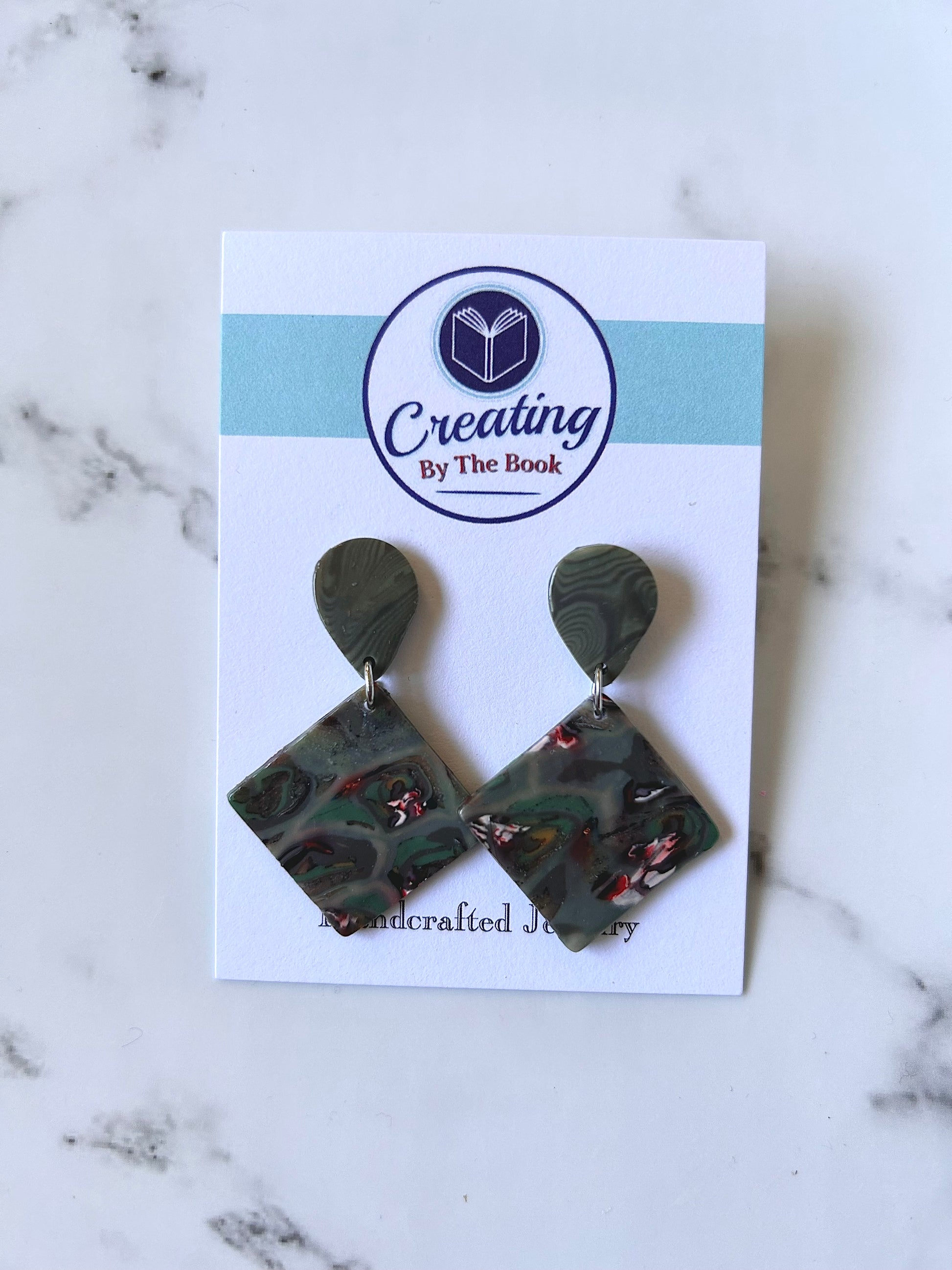 Showcase creativity in your outfit with our Green Garden Diamond Stud Dangle Earrings. Each unique gray green stud and square dangle is inspired by nature and crafted from upcycled scrap clay. Their lightweight design and subtle green shades make them truly one-of-a-kind. Only one pair available for those seeking something truly unique.