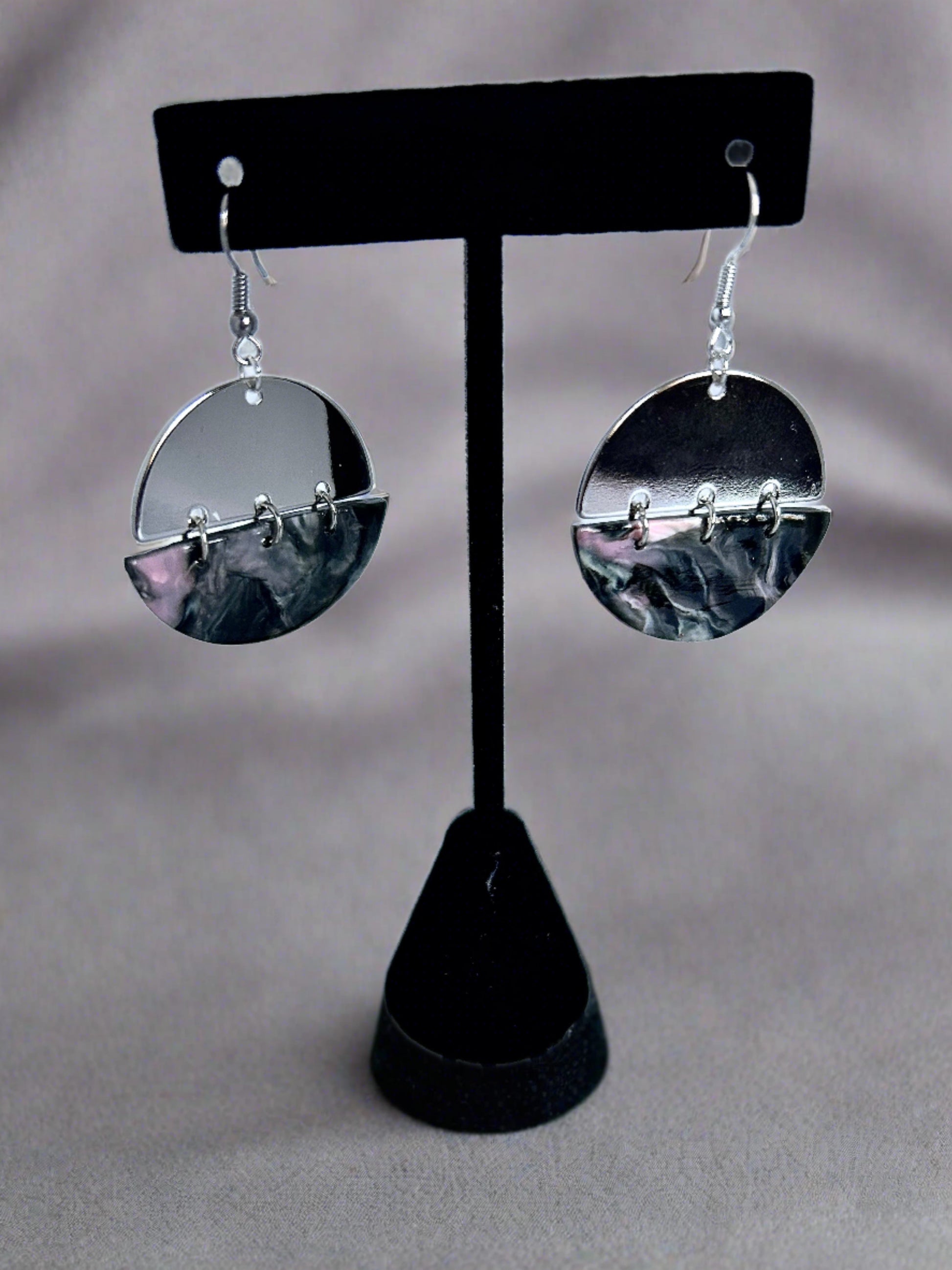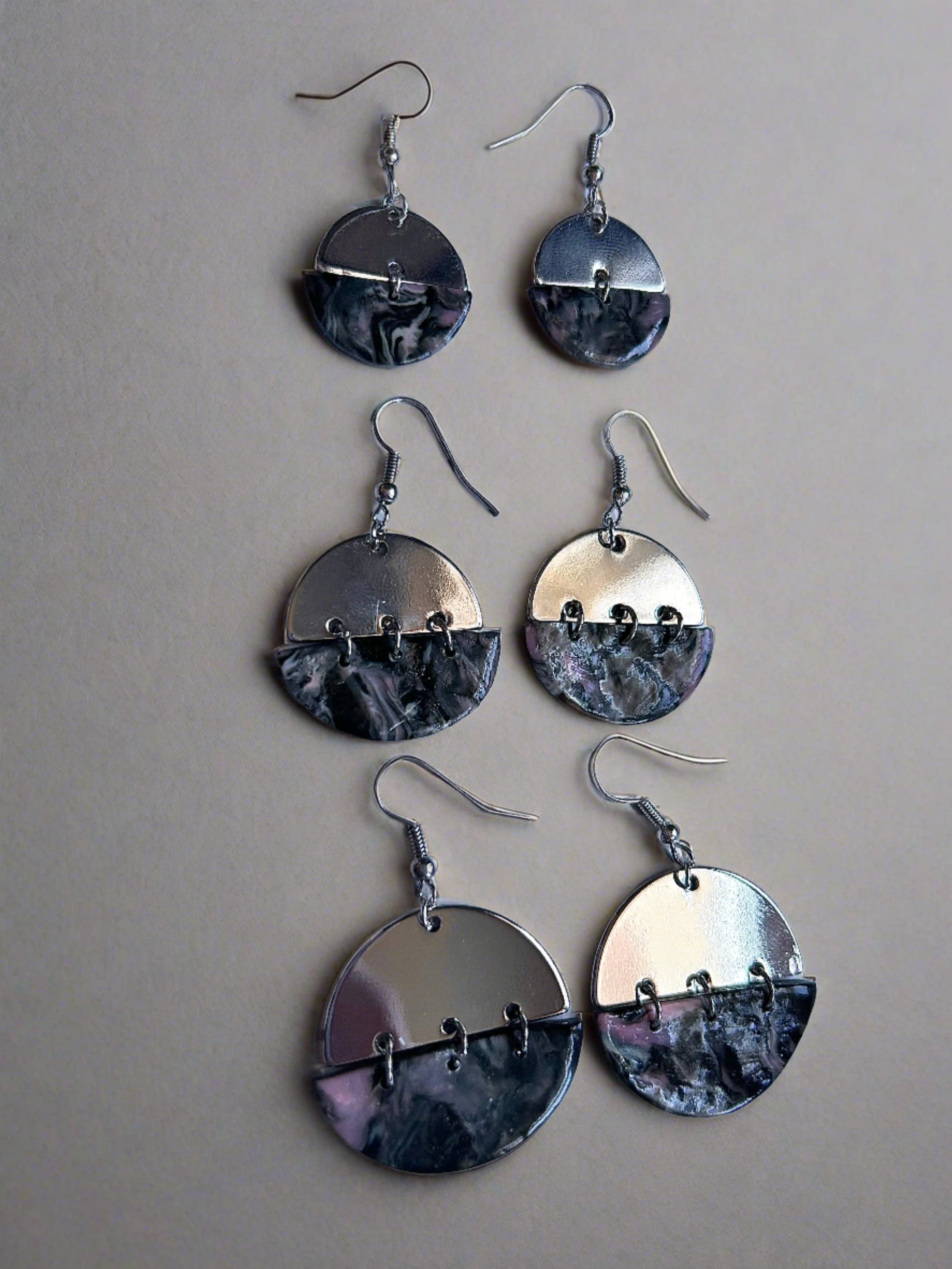 Upgrade your earring collection with our Mixed Media Earrings. Featuring a stunning combination of shiny metal and polymer clay, these earrings are both unique and eye-catching. The faux granite polymer clay in gray and pink adds a touch of elegance. Available in three sizes, these earrings are perfect for any occasion.