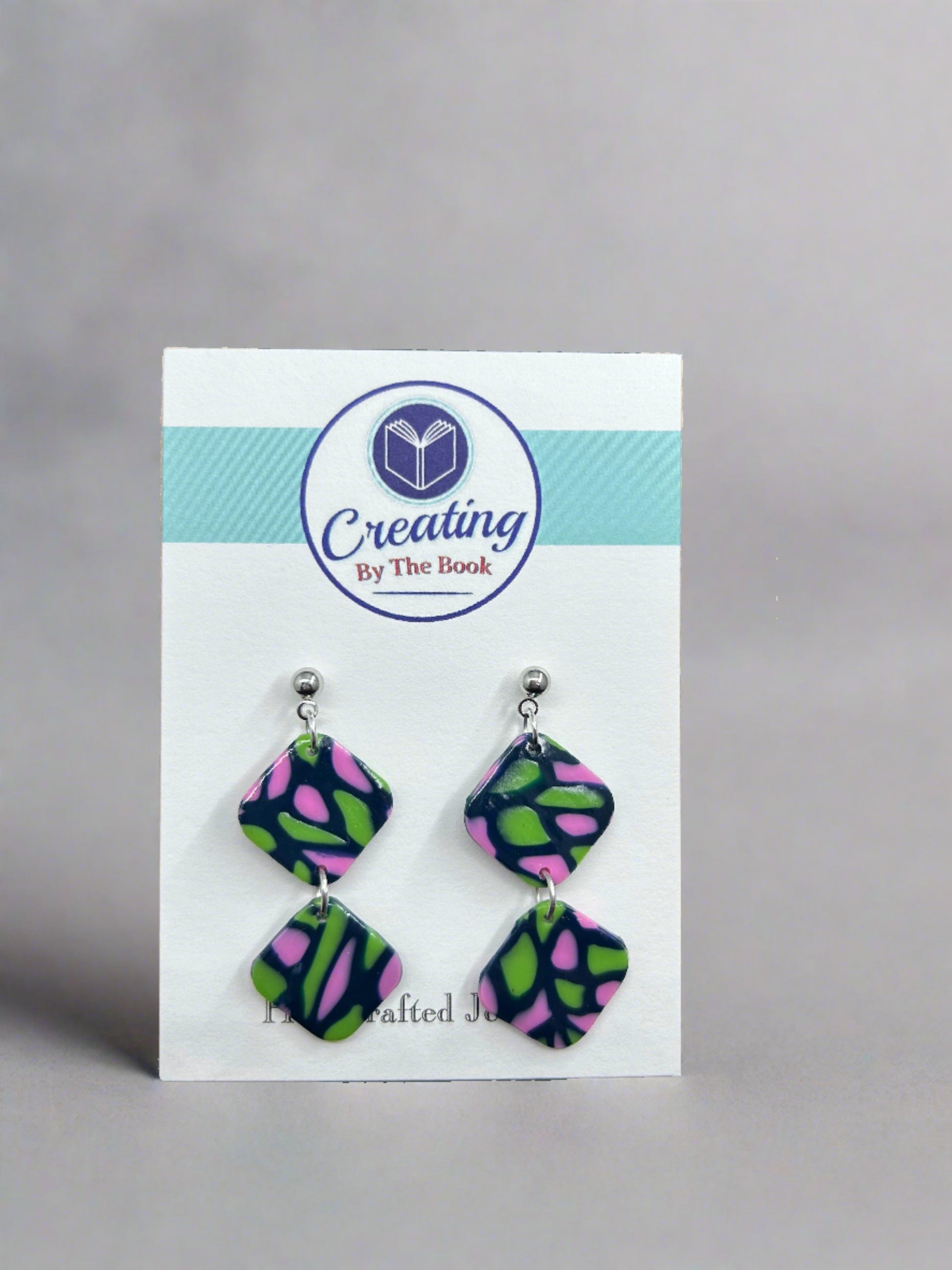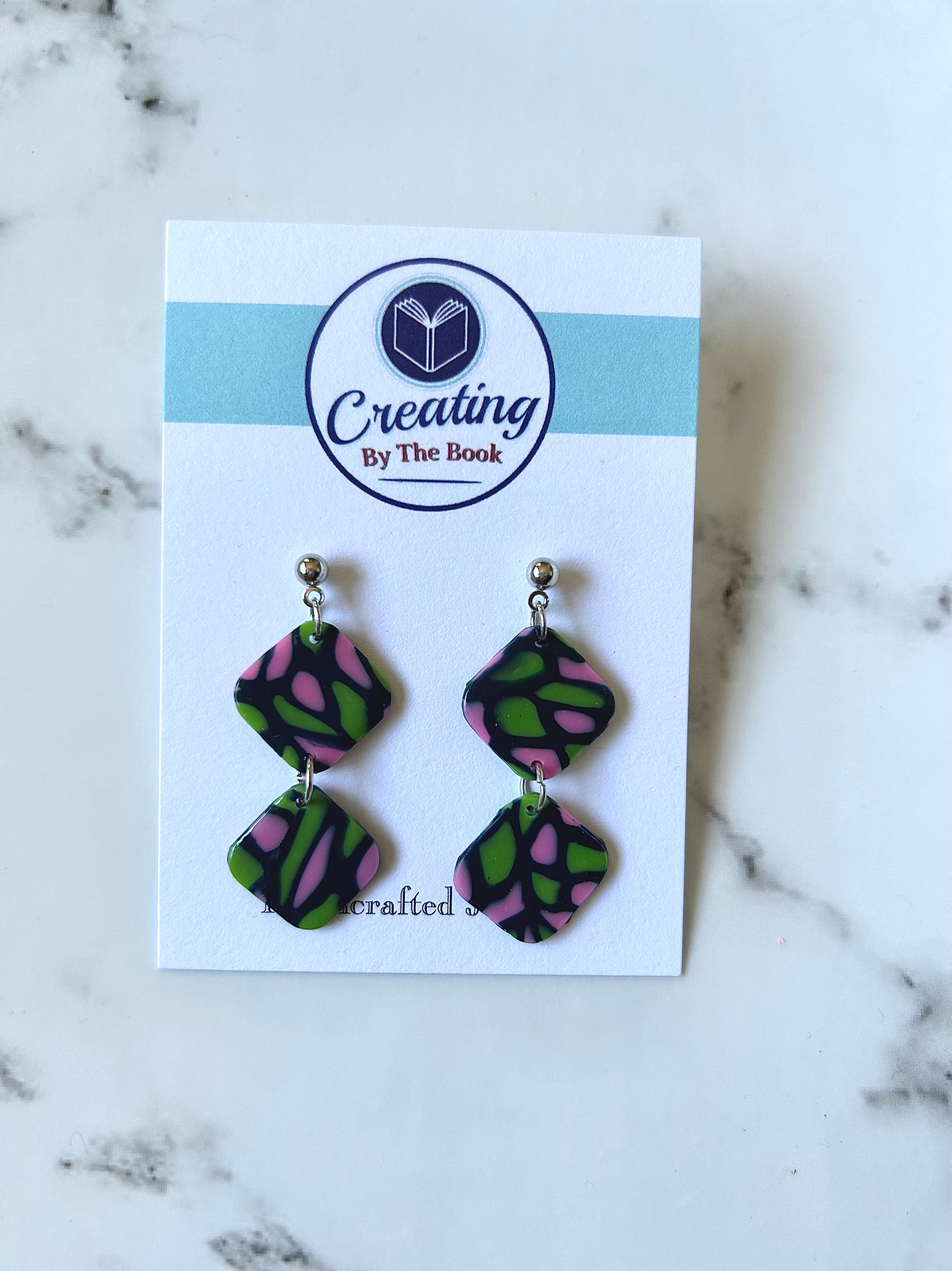 Add gorgeous color to your outfit with our Pink and Green Stained Glass Emily Earrings. These earrings feature a unique stained glass pattern made from lightweight and durable polymer clay. The combination of pink and green hues creates a vibrant and eye-catching accessory that will make any outfit stand out. The earrings are designed with two square shapes, offering a modern and sophisticated touch to your look.